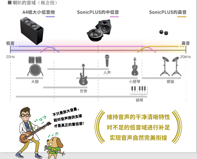 我們知道SonicPLUS系列揚(yáng)聲器的音質(zhì)干凈,清晰,還原性好。能與這種音質(zhì)融為一體,重生出自然,有躍動(dòng)感重低音的,就是這款A(yù)4紙大小低音炮。 它的音質(zhì)完全不同于那些只能將聲音放大,悶聲悶氣不鮮明的低音。