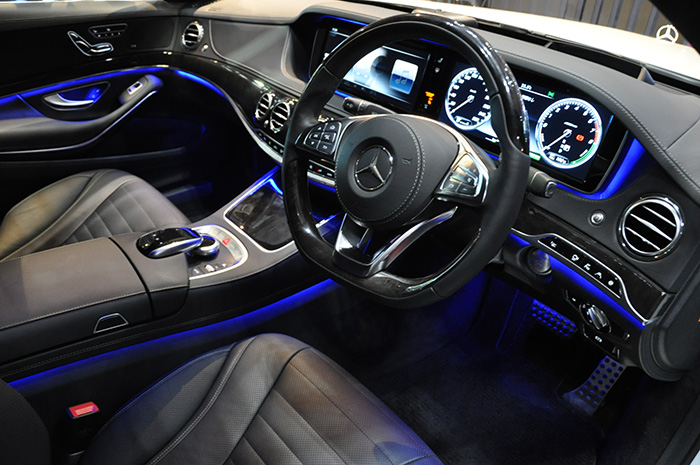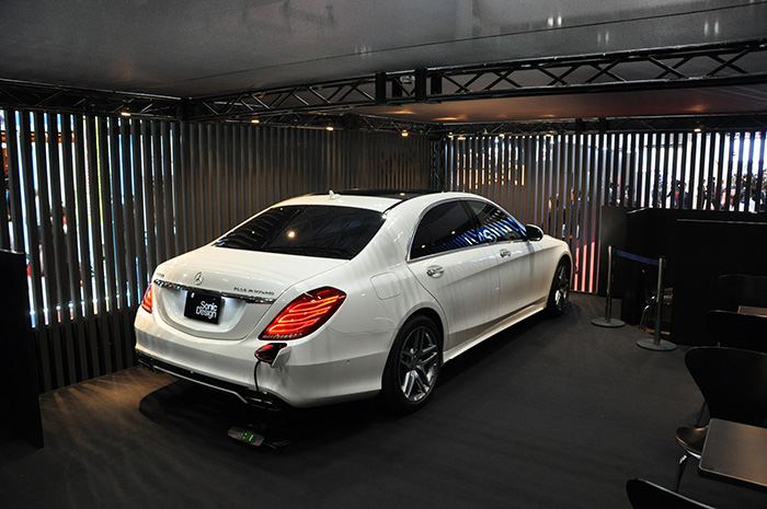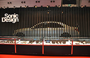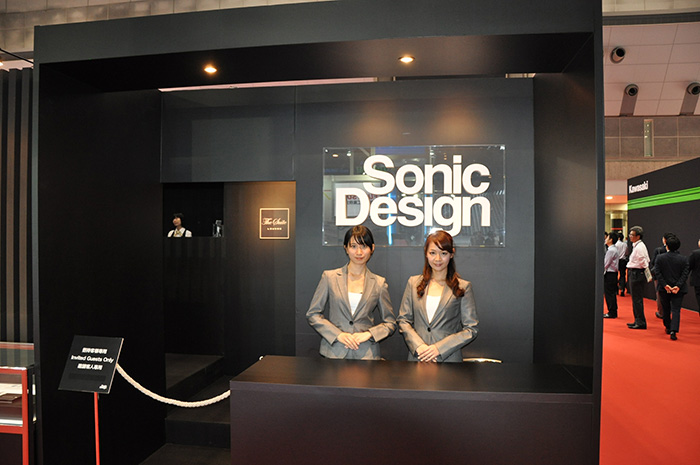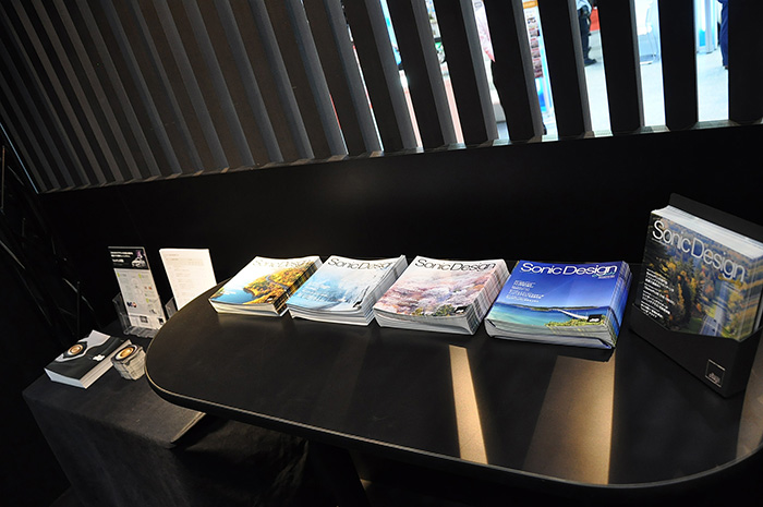 由黑色立柱構(gòu)建的展臺(tái)雖然簡潔但卻格外引人注目,仿佛是在向人們宣示聲麗創(chuàng)音品牌的品質(zhì)和美感。咋一看,不過是黑色箱體的展臺(tái),換個(gè)角度后,隱藏在里面的奔馳S550e加長型插電式混合動(dòng)力車就會(huì)浮現(xiàn)在眼前。展車上裝載的「SonicPLUS THE CREST」音響套裝,是奔馳和聲麗創(chuàng)音頂級(jí)產(chǎn)品和技術(shù)的組合,作為聲麗創(chuàng)音的象征,極盡高端汽車音響品牌霸主的氣質(zhì)。在展臺(tái)接待處備有講解聲麗創(chuàng)音設(shè)計(jì)理念的資料和產(chǎn)品說明、以及聲麗創(chuàng)音發(fā)行的「Sonic Design Quarterly」彩頁等,可幫助來訪者深入了解聲麗創(chuàng)音品牌。