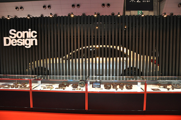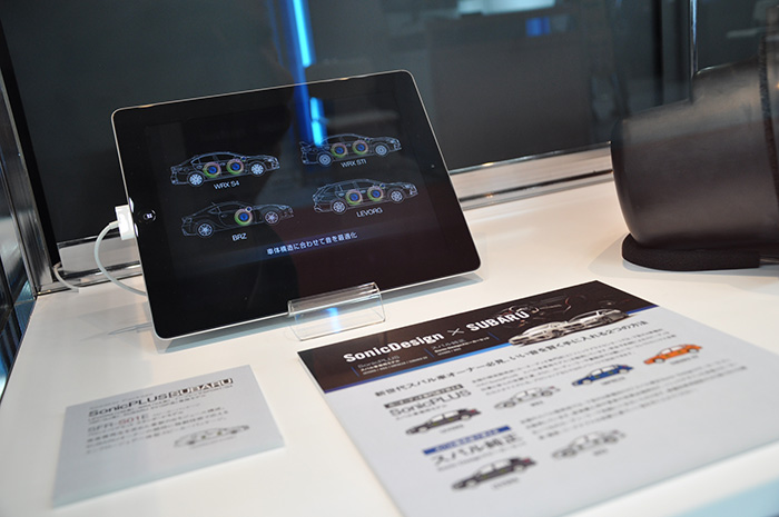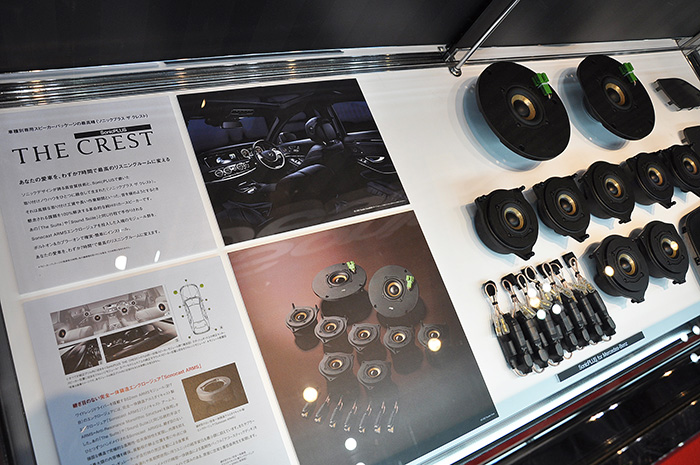 設(shè)置在「甜美空間」外壁的展柜中展示著聲麗創(chuàng)音的豐富產(chǎn)品群。有可對(duì)應(yīng)奔馳/寶馬/MINI/奧迪/豐田/斯巴魯6大知名廠家的車種專用揚(yáng)聲器套裝「SonicPLUS」,和被斯巴魯采用為原裝可選揚(yáng)聲器的WRX/LEVORG用「Sonic Design揚(yáng)聲器套裝」等。還配備了揭示產(chǎn)品特性、要點(diǎn)的宣傳板和動(dòng)畫。即便是初次接觸高檔揚(yáng)聲器材的人,通過展示資料和現(xiàn)場(chǎng)職員的演示,也能很容易了解聲麗創(chuàng)音和其產(chǎn)品及聲麗創(chuàng)音對(duì)開創(chuàng)品牌所作的不懈努力。