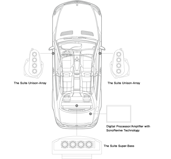 論是音質(zhì)音域的調(diào)整還是電力增幅,都可以進行嚴格控制的數(shù)碼放大器●將原裝音響的聲音高品質(zhì)重現(xiàn)的SonoRevive技術●由兩組共四個口徑只有52毫米的寬波段驅(qū)動器SD-N52N組成的無縫高精度鋁壓鑄全頻驅(qū)動器「The Suite Unison-Array」●裝有專用端口調(diào)節(jié)器、由一組共兩個頂級微型揚聲器單元「SD-N77N」組成的雙重高精度鋁壓鑄可添加式揚聲系統(tǒng)「The Suite Extend-Woofer」●根據(jù)乘客的有無而進行的音域和音質(zhì)的調(diào)節(jié)、和根據(jù)車門的開關和與倒車檔聯(lián)動的而對音響開關進行操作的全自動化控制