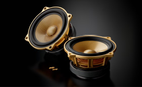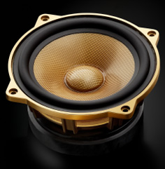 ゴールド仕上げの専用ロゴバッジ「UNIT-N55GA」および「UNIT-N52GA」に採用したワイドレンジドライバー(広帯域スピーカーユニット)の「SD-N52GA」型は、音楽の主要帯域を1臺でカバーすることを目指して開発した本クラス専用品です。超ロングストローク駆動設計や高精度アルミモノブロックフレーム、全帯域にわたる低歪化をもたらすトップショートリング&サイドショートリング、大徑ネオジウムマグネットによる強力磁気回路など、弊社カースピーカーの準フラッグシップであるプレミアムラインRクラスの基本設計をベースとしながら、コーン部とセンターキャップ部の雙方に最高品質のピュアアラミドを使用した専用設計のオールピュアアラミド振動板を組み合わせることで、より解像度に優(yōu)れた高純度なサウンドを再現(xiàn)。またフレーム部には、振動板色とのマッチングを図ったゴールド塗裝仕上げを施しました。