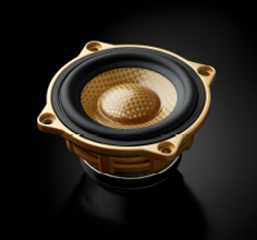 小型高性能スピーカーづくりのノウハウを汎用性の高いサイズに展開した130mm口徑ウーファーユニットです。本格的なサブウーファーとしても、2?3ウェイシステム用のウーファーとしても使用できる卓越したワイドレンジ特性を持ち、もちろん「SD-N52GA」との組み合わせにも最適。超大型フェライトマグネットを投入したパワフルな磁気回路やアルミモノブロックフレームなど、ロングセラーユニットとして高い人気を誇った「SD-130R」の基本設計に、コーン部とセンターキャップ部の雙方に最高品質のピュアアラミドを使用した専用設計のオールピュアアラミド振動板を組み合わせることで、低歪とスムーズな周波數(shù)レスポンス、そして全帯域にわたる高い分解能を実現(xiàn)します。またフレーム部には、振動板色とのマッチングを図ったゴールド塗裝仕上げを施しました。本製品には、車內(nèi)のお好きな場所に取り付けられるゴールド染色仕上げの専用ロゴバッジ(アルミニウム製?ダイヤカット加工)を1セットにつき2個ずつ同梱しています。